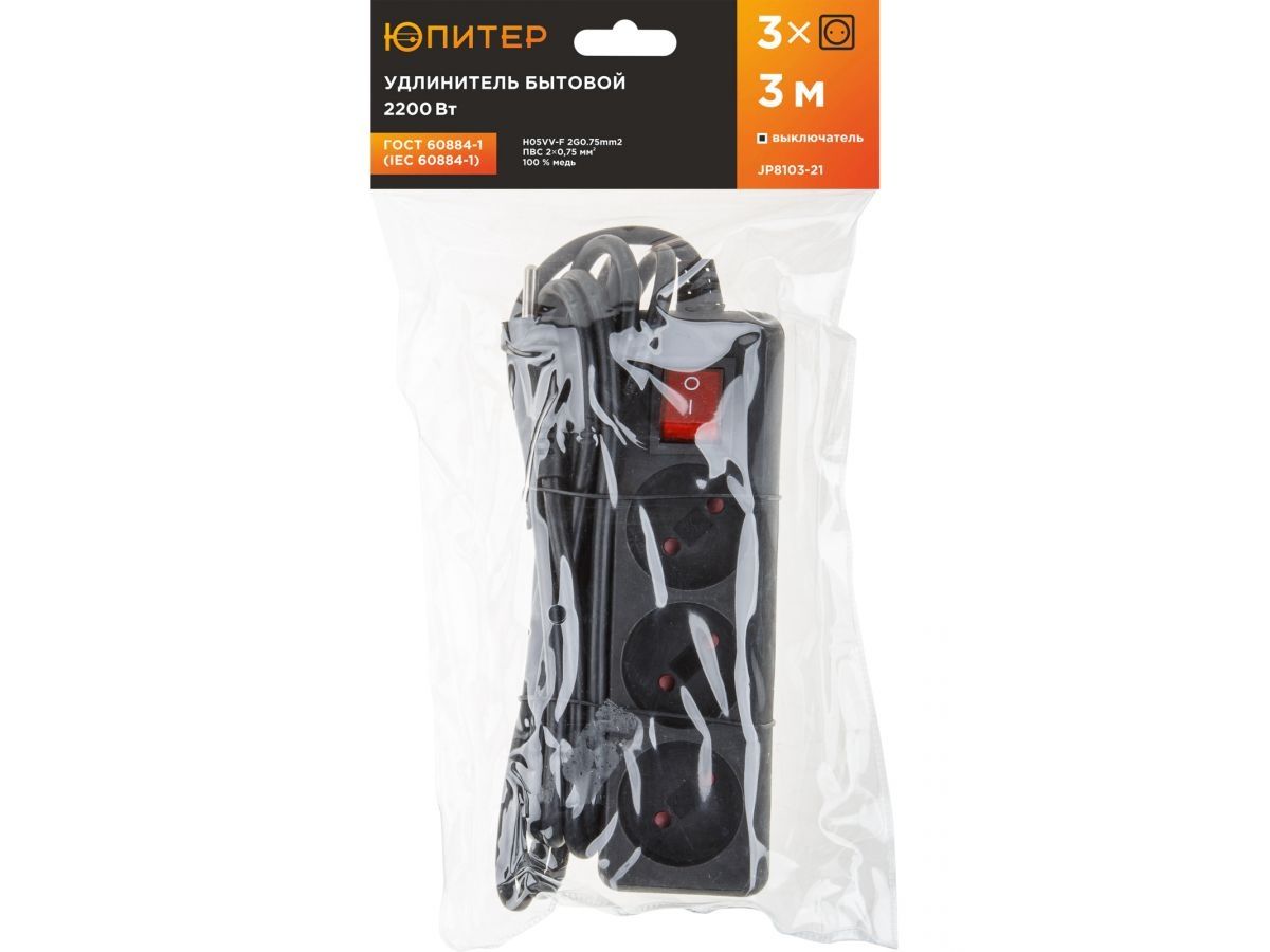 Удлинитель ЮПИТЕР изготовлен только из качественных материалов в соответствии с ГОСТ60884-1 и предназначен для подключения бытовых электрических приборов к электрической сети переменного тока внутри помещения.