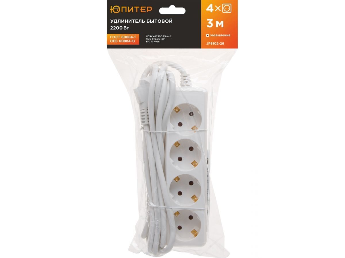 Удлинитель ЮПИТЕР изготовлен только из качественных материалов в соответствии с ГОСТ60884-1 и предназначен для подключения бытовых электрических приборов к электрической сети переменного тока внутри помещения.