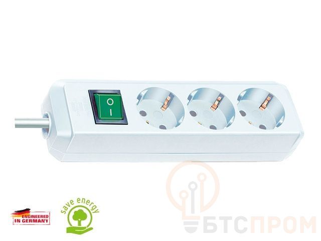 Удлинитель 5м (3 роз., 3.3кВт, с/з, выкл., ПВС) белый Brennenstuhl Eco-Line (провод 3х1,5мм2, сила тока 16А, с/з - с заземляющим контактом) 1152920