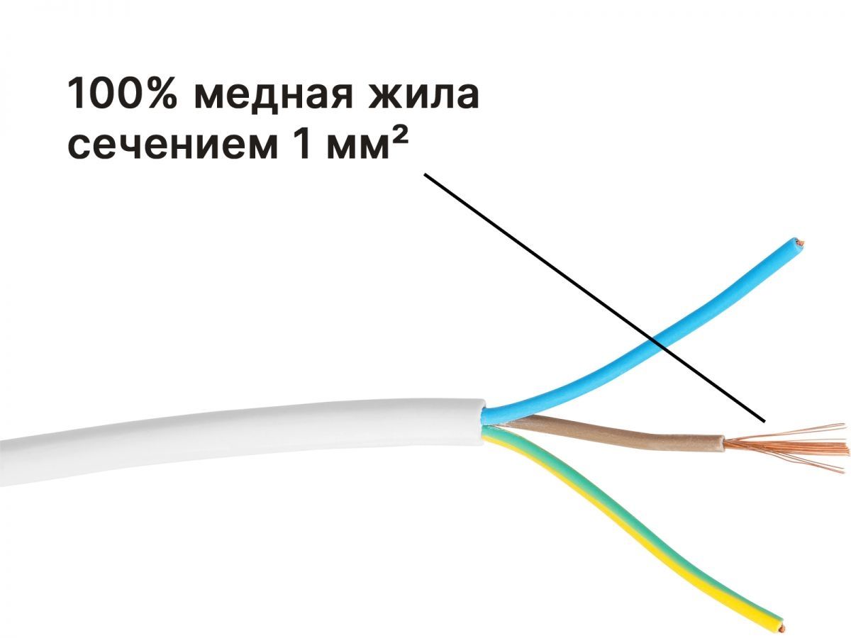 Реальное сечение провода из чистой меди гарантирует работоспособность удлинителя при подключении нагрузки до 2200Вт.