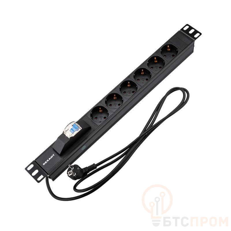 Блок распределения питания для 19дюйм шкафов; горизонт.; 6 розеток СЕЕ 7/4; 16А; автомат защиты; вилка СЕЕ 7/7; шнур 2м; корпус алюм. Rexant 04-0103-1