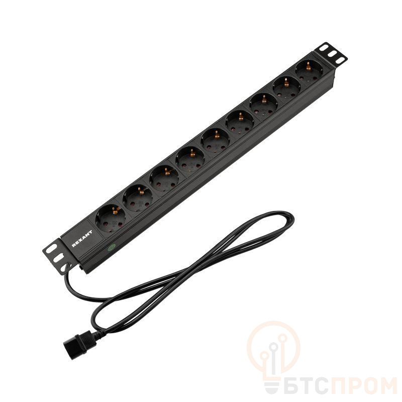 Блок распределения питания для 19дюйм шкафов; горизонт.; 9 розеток СЕЕ 7/4; 10А; без выключателя; вилка C14; шнур 2м; корпус алюм. Rexant 04-0305-1