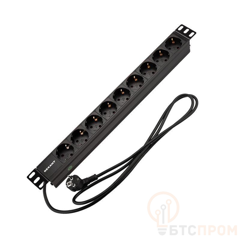 Блок распределения питания для 19дюйм шкафов; горизонт.; 9 розеток СЕЕ 7/4; 16А; без выключателя; вилка СЕЕ 7/7; шнур 2м; корпус алюм. Rexant 04-0105-1