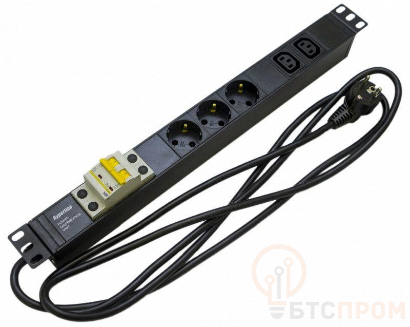 Блок розеток для 19дюйм шкафов горизонт. 3 розетки Schuko 2 розетки IEC320 C13 автомат. выкл. кабель питания 2.5м (3х1.5мм2) с вилкой Schuko 16А 250В 482.6х44.4х44.4мм (ДхШхВ) SHE19-3SH-2IEC-B-2.5EU Hyperline 397015