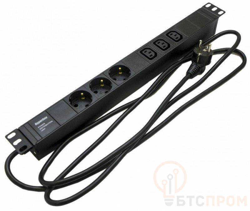 Блок розеток для 19дюйм шкафов горизонт. 3 розетки Schuko 3 розетки IEC320 C13 кабель питания 2.5м (3х1.5мм2) с вилкой Schuko 16А 250В 482.6х44.4х44.4мм (ДхШхВ) сталь SHE19-3SH-3IEC-2.5EU черн. Hyperline 397016