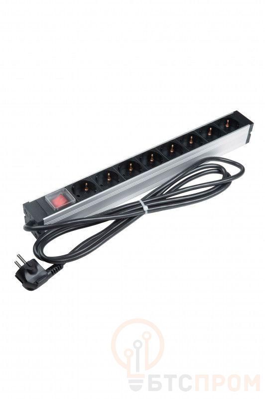 Блок розеток для 19дюйм шкафов горизонт. 8 розеток Schuko выкл. с подсветкой кабель питания 2.5м (3х1.5мм2) с вилкой Schuko 16А 250В 482.6х44.4х44.4мм (ДхШхВ) алюм. SHZ19-8SH-S-2.5EU Hyperline 459583