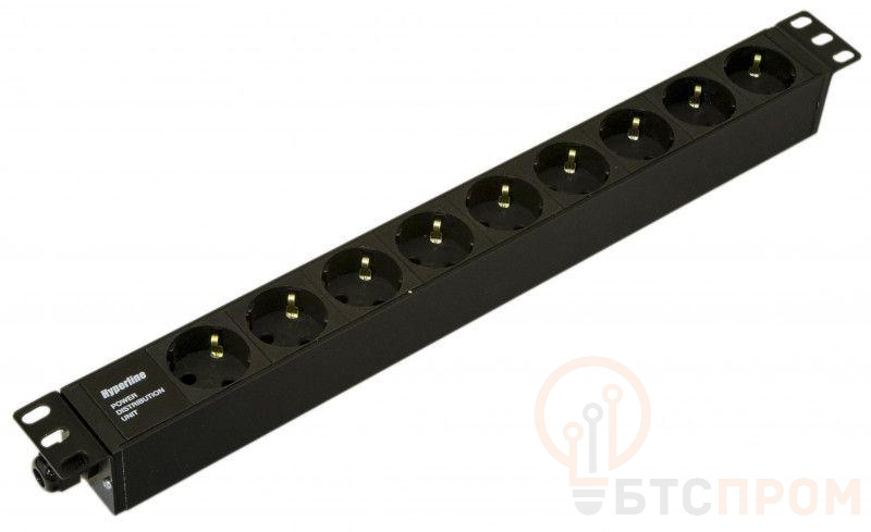 Блок розеток для 19дюйм шкафов горизонт. 9 розеток Schuko без кабеля питания клеммная колодка 16А 250В 482.6х44.4х44.4мм (ДхШхВ) сталь SHE19-9SH-CB черн. Hyperline 481763