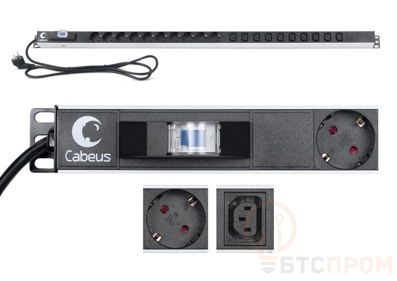 Блок розеток для 19дюйм шкафов PDU-16-10S-10C13-B вертик. 10 розеток Schuko 10 розеток IEC 320 C13 16А автомат защиты алюм. корпус шнур с вилкой Schuko 2м Cabeus 9552c
