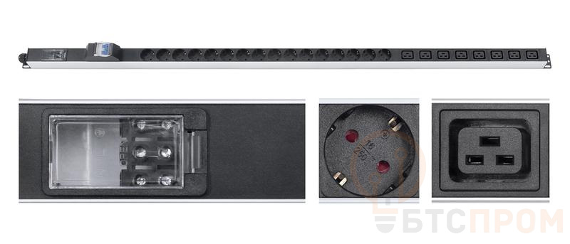 Блок розеток для 19дюйм шкафов PDU-32-16S-8C19-B-T вертик. 16 розеток Schuko 8 розеток IEC 320 C19 32А автомат защиты алюм. корпус клем. колодка Cabeus 9545c