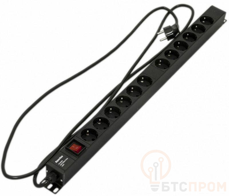 Блок розеток вертик. 12 розеток Schuko выкл. с подсветкой.Кабель питания 2.5м (3х1.5мм2) с вилкой Schuko 16А 250В 730х44.4х44.4мм (ДхШхВ) сталь SHE-12SH-S-2.5EU черн. Hyperline 396987