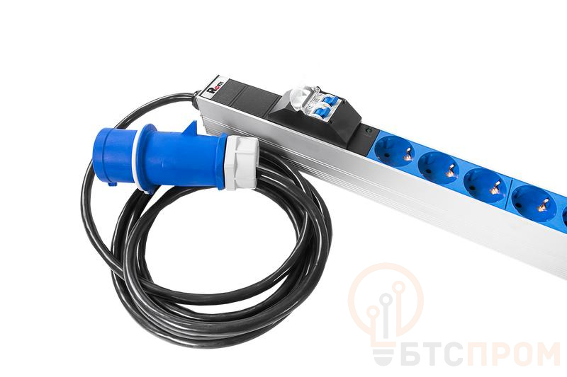 Блок оснащен 16 розетками: 12 стандартных типа C13 и 4 усиленных типа C19, что позволяет одновременно подключать разнообразное оборудование, включая серверные стойки, мощные рабочие станции, сварочные аппараты и промышленные приборы. Дополнительные автоматические индикаторы сети на каждой розетке обеспечивают визуальный контроль подачи питания. Важной особенностью является входное подключение через разъем IEC 309 с угловой вилкой и длинным медным шнуром 3 метра, что повышает удобство монтажа и эксплуатации.