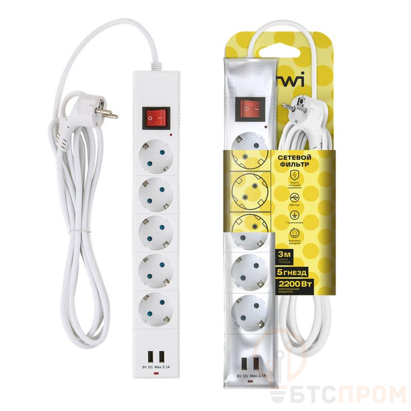 Фильтр сетевой 5х3м с/з со шторками ПВС 3 IP075 2USB 2200Вт 10А бел. Duwi 32592 5 фото в каталоге от BTSprom.by