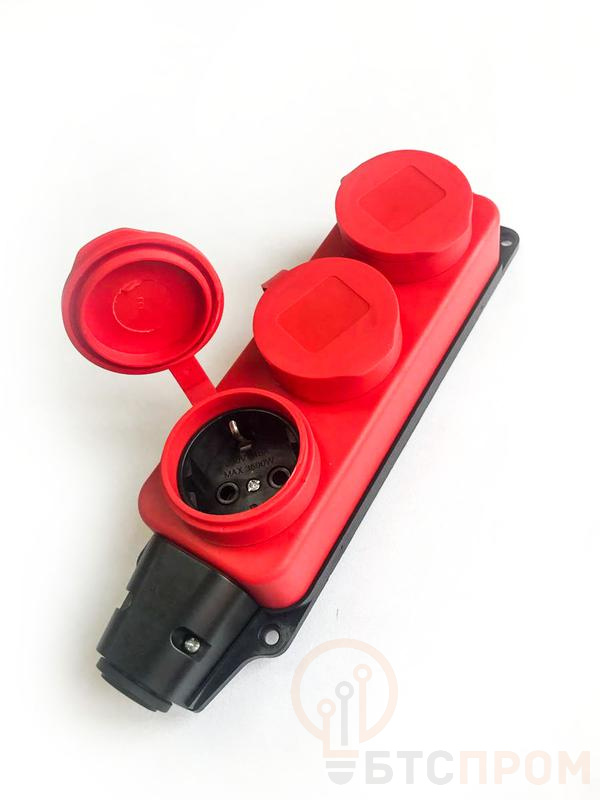 Колодка оснащена тремя розетками с заземляющим контактом, рассчитанными на номинальный ток 16А и напряжение до 250В. Наличие заземления гарантирует безопасность при использовании мощного электрооборудования. Эластичная каучуковая заглушка надежно защищает контакты от внешних воздействий, когда вилка не подключена.