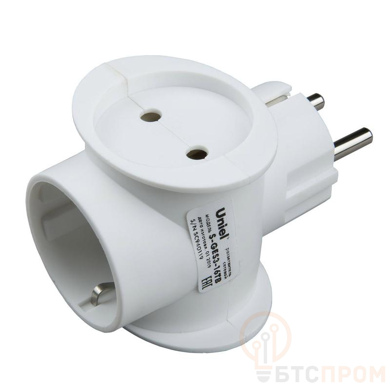 Разветвители и переходники сетевые / Серия Standard: Разветвители и переходники сетевые предназначены для подключения в закрытых помещениях к одной розетке электрической сети переменного тока одновременно нескольких электроприборов. Изготовлены из ударопрочной электроизолирующей пластмассы белого цвета. В ассортименте представлены различные модели, отличающиеся наличием заземления, защитных шторок и количеством гнёзд. Дизайн изделий традиционен и вписывается в интерьер любого помещения — от бытового до офисного. Разветвители и переходники сетевые незаменимы на даче, в гараже, квартире и в офисных помещениях. Преимущества: Негорючий ударопрочный корпус Защита от доступа детей (часть моделей) Встроенный выключатель (часть моделей) Строгое соответствие ГОСТ РФ Разветвитель сетевой Uniel S-GES3-16TB, количество розеток – 3, максимальный ток - 16А, максимальная мощность нагрузки – 3500Вт, заземление, выключатель.
