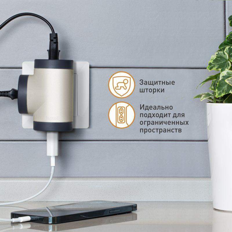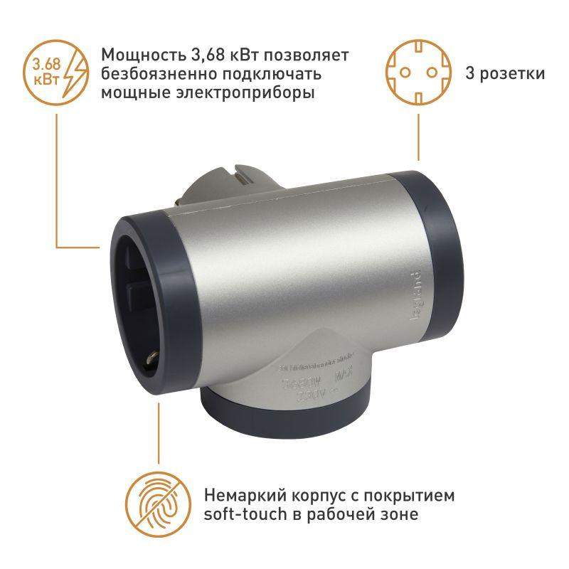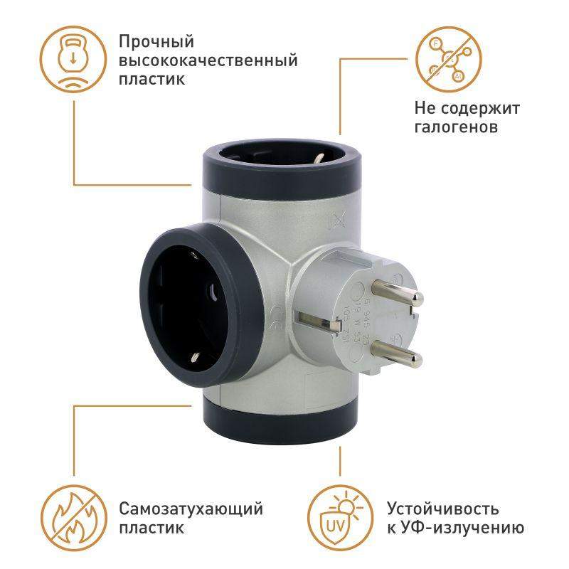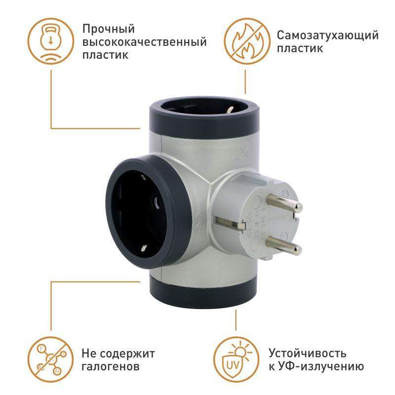 Тройник с розетками по сторонам идеально подходит для мест, где мало розеток и где необходимо подключать большое количество электроприборов в ограниченном пространстве. Конструкция тройника позволяет безбоязненно подключать мощные электроприборы до 3,86 кВт (16А). Корпус тройника выполнен из прочного немаркого двухкомпонентного материала с покрытием soft-touch. Все розетки оснащены защитными шторками, которые ограничивают доступ к токоведущим контактам. Высококачественный самозатухающий пластик корпуса не содержит галогенов, устойчив к ультрафиолетовому излучению. Всё это обеспечивает долговечное и безопасное использование тройника.