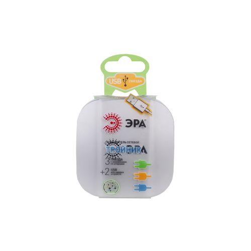 Тройник (адаптер) ЭРА с 3-мя розетками и 2-мя USB гнездами для зарядки портативных устройств. Идеален для зарядки мобильных телефонов и планшетов. Незаменим с собой в дороге. Особенно актуален когда в помещении мало источников подключения - можно из одной розетки сделать три и при этом ещё заряжать 2 устройства одновременно через USB. Максимальная мощность USB разъемов: 2100 мА. Разработан в России.