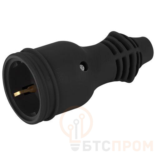 Корпус устройства выполнен из ударопрочного каучука черного цвета, что гарантирует долговечность и стойкость к механическим воздействиям. Розетка рассчитана на номинальный ток 16А и напряжение до 250В, оснащена заземляющими контактами для повышенной электробезопасности. Конструкция является прямой, без углового исполнения.