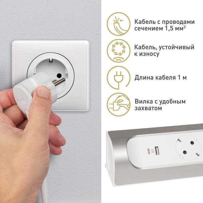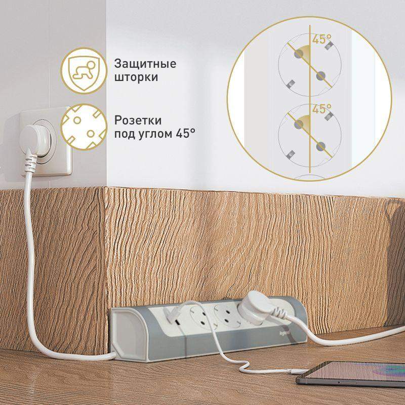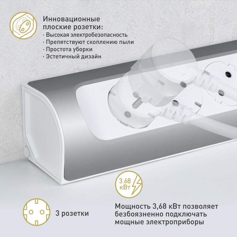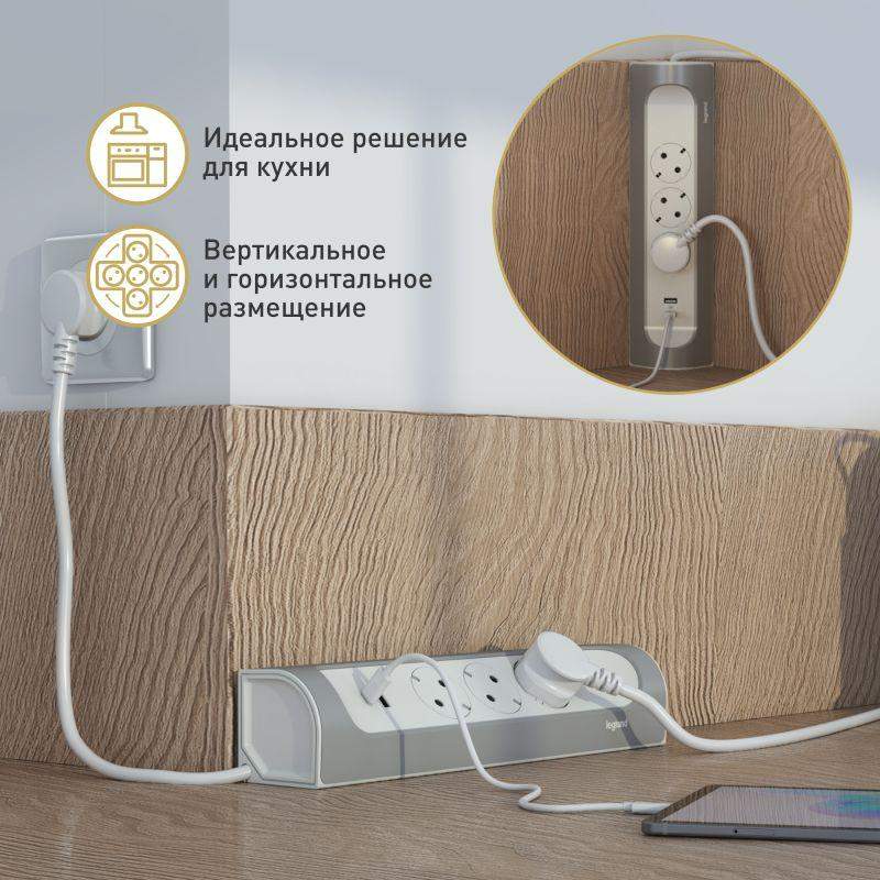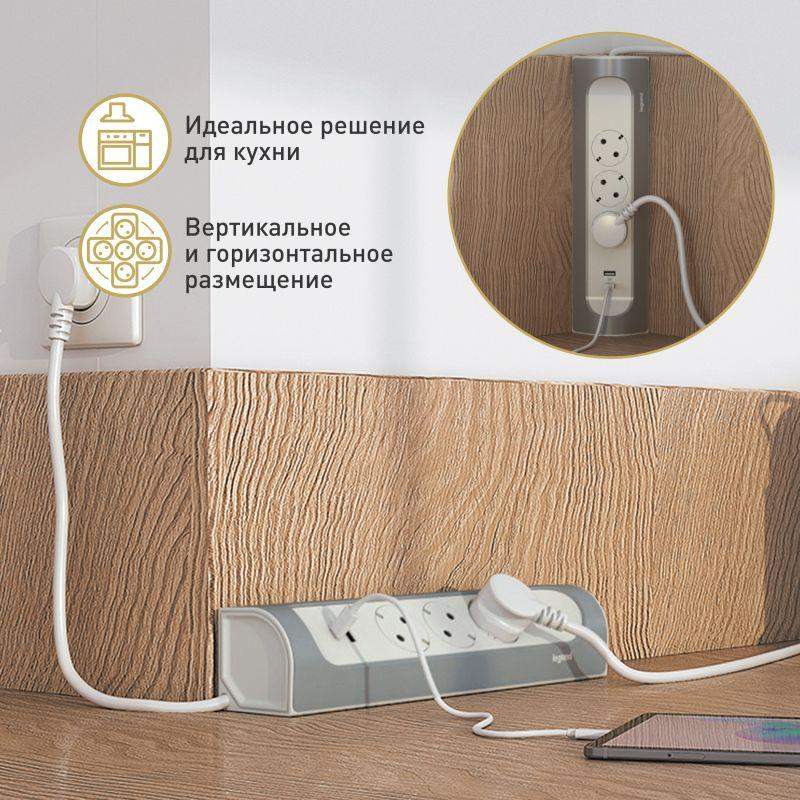 Предназначен для самостоятельного создания удлинителя с необходимой длиной кабеля. Также незаменим для подключения большого количества электроприборов к одной розетке. Идеальное решение для интеграции с кухонной мебелью или организации рабочего места в ограниченном пространстве. Удлинитель можно установить в горизонтальный или вертикальный угол. Это значительно расширяет область применения удлинителя и позволяет эффективнее использовать рабочее пространство. Удлинитель оснащен 15 Вт (3А) универсальным USB зарядным устройством с новым удобным и мощным разъемом Type-C и привычным разъемом Type-A. Это позволяет быстро заряжать мобильные устройства и гаджеты, даже когда все розетки заняты. Инновационные плоские розетки удлинителя идеально сочетаются с современным дизайном удлинителя. При этом обладают высокой степенью безопасности и препятствуют скоплению пыли в розетках, тем самым значительно сокращают время на его уборку. Конструкция удлинителя позволяет закрепить его на поверхности с помощью шурупов или двусторонней клейкой лентой, входящей в комплект. При этом монтаж не вызовет затруднений благодаря держателю кабеля и легко удаляемым заглушкам для вывода кабеля, а также возможности вывести кабель с любой стороны. Конструкция удлинителя позволяет безбоязненно подключать мощные электроприборы до 3,86 кВт (16А). Высококачественный самозатухающий пластик корпуса не содержит галогенов, устойчив к ультрафиолетовому излучению. Всё это обеспечивает долговечное и безопасное использование удлинителя.