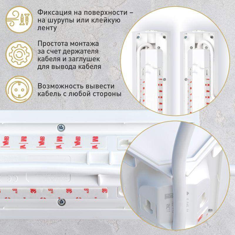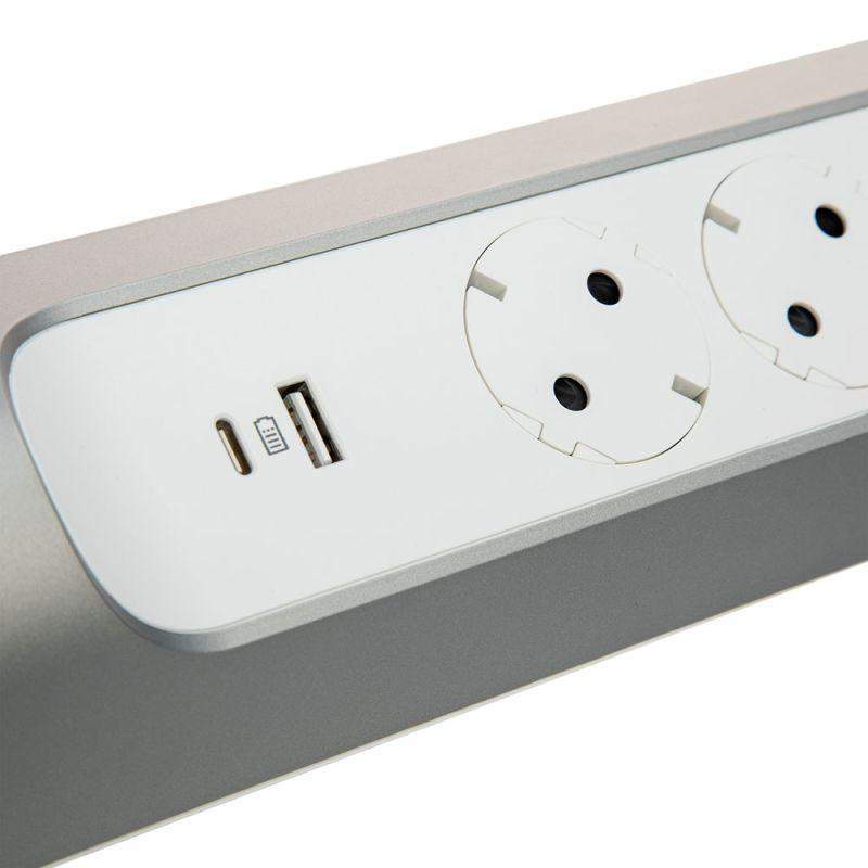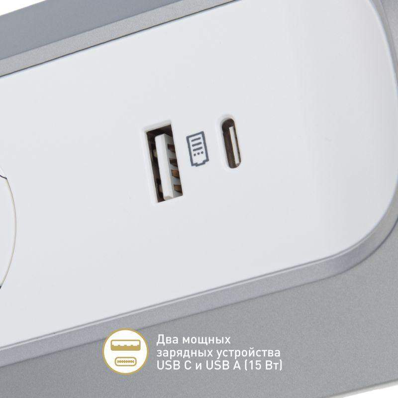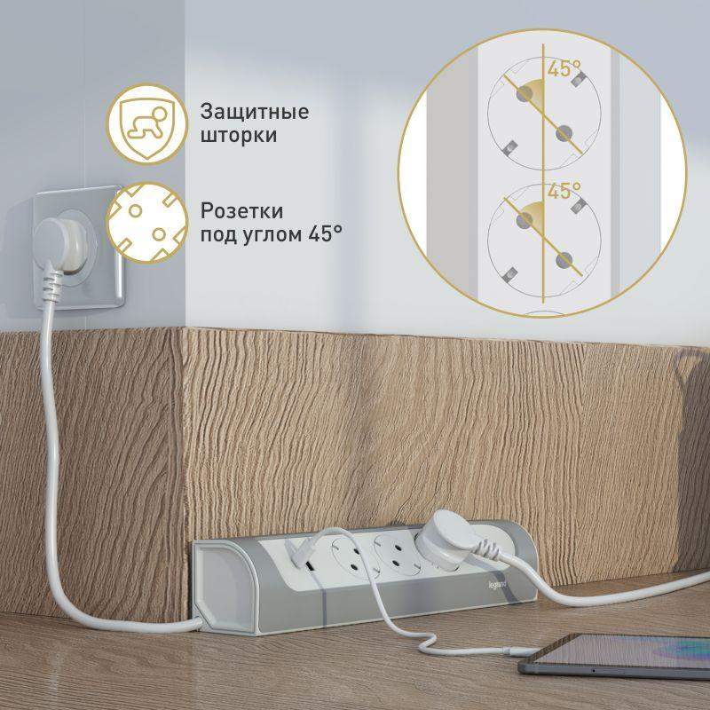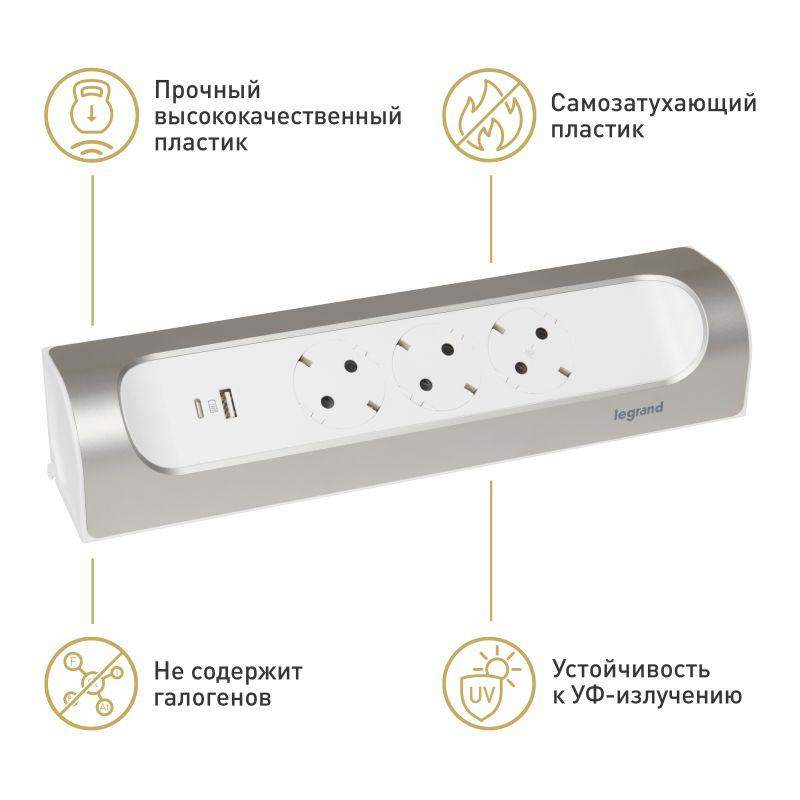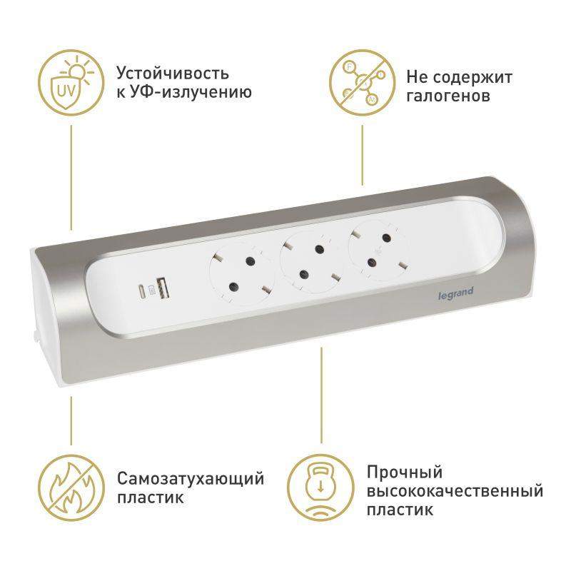Предназначен для самостоятельного создания удлинителя с необходимой длиной кабеля. Также незаменим для подключения большого количества электроприборов к одной розетке. Идеальное решение для интеграции с кухонной мебелью или организации рабочего места в ограниченном пространстве. Удлинитель можно установить в горизонтальный или вертикальный угол. Это значительно расширяет область применения удлинителя и позволяет эффективнее использовать рабочее пространство. Удлинитель оснащен 15 Вт (3А) универсальным USB зарядным устройством с новым удобным и мощным разъемом Type-C и привычным разъемом Type-A. Это позволяет быстро заряжать мобильные устройства и гаджеты, даже когда все розетки заняты. Инновационные плоские розетки удлинителя идеально сочетаются с современным дизайном удлинителя. При этом обладают высокой степенью безопасности и препятствуют скоплению пыли в розетках, тем самым значительно сокращают время на его уборку. Конструкция удлинителя позволяет закрепить его на поверхности с помощью шурупов или двусторонней клейкой лентой, входящей в комплект. При этом монтаж не вызовет затруднений благодаря держателю кабеля и легко удаляемым заглушкам для вывода кабеля, а также возможности вывести кабель с любой стороны. Конструкция удлинителя позволяет безбоязненно подключать мощные электроприборы до 3,86 кВт (16А). Высококачественный самозатухающий пластик корпуса не содержит галогенов, устойчив к ультрафиолетовому излучению. Всё это обеспечивает долговечное и безопасное использование удлинителя.