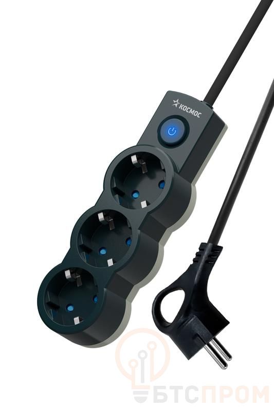 Удлинитель 3х1.5м с заземл. 10А IP20 2200Вт 220В защ. шторки ПВС 3х1 с выкл. черн. КОСМОС YKsm1.5m-3g-Z-V10A-B