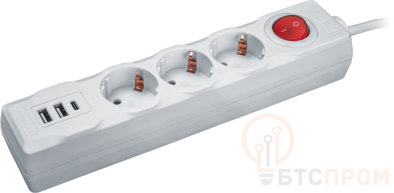 Длина кабеля составляет 1.8 метра, обеспечивая удобное размещение и мобильность. Корпус имеет степень защиты IP20, что гарантирует безопасность от проникновения твердых предметов и предостерегает от использования в условиях повышенной влажности. Дополнительным преимуществом являются два встроенных USB-порта с суммарным током 2.1А для быстрой зарядки мобильных устройств без необходимости использования сетевых адаптеров. На корпусе расположен выключатель с индикатором питания для удобного и визуального контроля работы.