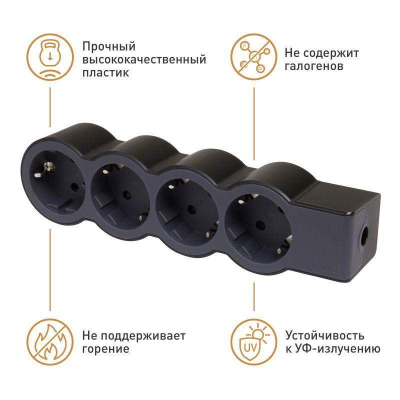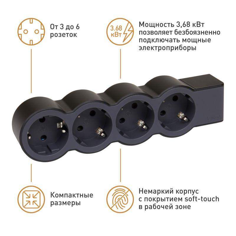 Предназначен для самостоятельного создания удлинителя с необходимой длиной кабеля. Конструкция позволяет безбоязненно подключать мощные электроприборы до 3,86 кВт (16А). При этом он обладает компактными размерами, позволяющими размещать удлинитель в ограниченном пространстве (например, под мебелью). Корпус выполнен из прочного немаркого двухкомпонентного материала с покрытием soft-touch. Все розетки оснащены защитными шторками, которые ограничивают доступ к токоведущим контактам. Высококачественный самозатухающий пластик корпуса не содержит галогенов, устойчив к ультрафиолетовому излучению. Всё это обеспечивает долговечное и безопасное использование.