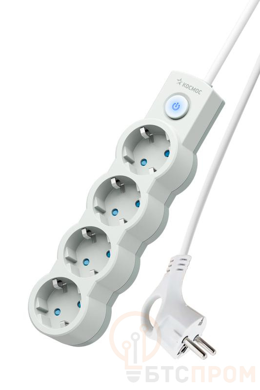 Удлинитель 4х5м с заземл. 10А IP20 2200Вт 220В защ. шторки ПВС 3х1 с выкл. бел. КОСМОС YKsm5m-4g-Z-V10A-W