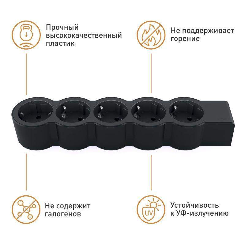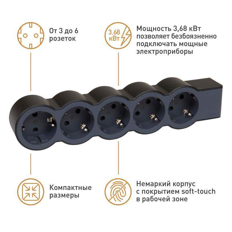 Предназначен для самостоятельного создания удлинителя с необходимой длиной кабеля. Конструкция позволяет безбоязненно подключать мощные электроприборы до 3,86 кВт (16А). При этом он обладает компактными размерами, позволяющими размещать удлинитель в ограниченном пространстве (например, под мебелью). Корпус выполнен из прочного немаркого двухкомпонентного материала с покрытием soft-touch. Все розетки оснащены защитными шторками, которые ограничивают доступ к токоведущим контактам. Высококачественный самозатухающий пластик корпуса не содержит галогенов, устойчив к ультрафиолетовому излучению. Всё это обеспечивает долговечное и безопасное использование.