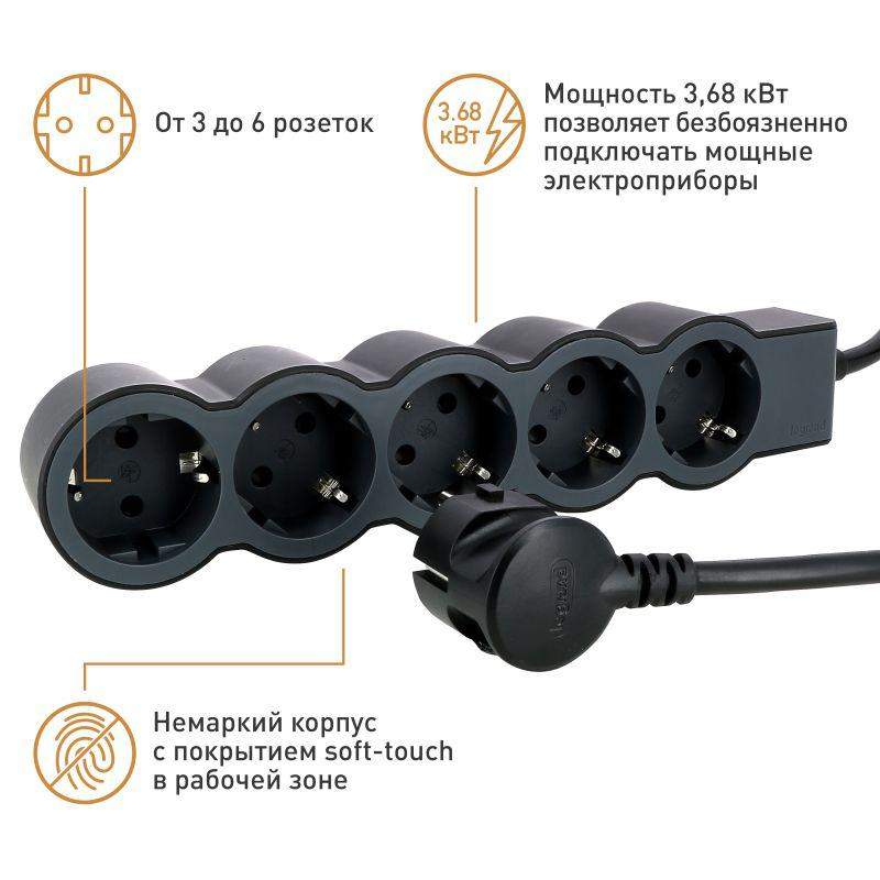 Удлинитель предназначен для подключения электроприборов, расположенных далеко от розеток. Также незаменим для подключения большого количества электроприборов к одной розетке. Конструкция удлинителя и кабель сечением 1,5 мм2 позволяет безбоязненно подключать мощные электроприборы до 3,86 кВт (16А). При этом он обладает компактными размерами, позволяющими размещать удлинитель в ограниченном пространстве (например, под мебелью). Прочная литая вилка с удобным захватом долговечна и удобна при использовании, а специальный кабель устойчив к износу, ударам, неглубоким повреждениям. Корпус удлинителя выполнен из прочного немаркого двухкомпонентного материала с покрытием soft-touch. Все розетки оснащены защитными шторками, которые ограничивают доступ к токоведущим контактам. Высококачественный самозатухающий пластик корпуса не содержит галогенов, устойчив к ультрафиолетовому излучению. Всё это обеспечивает долговечное и безопасное использование удлинителя.
