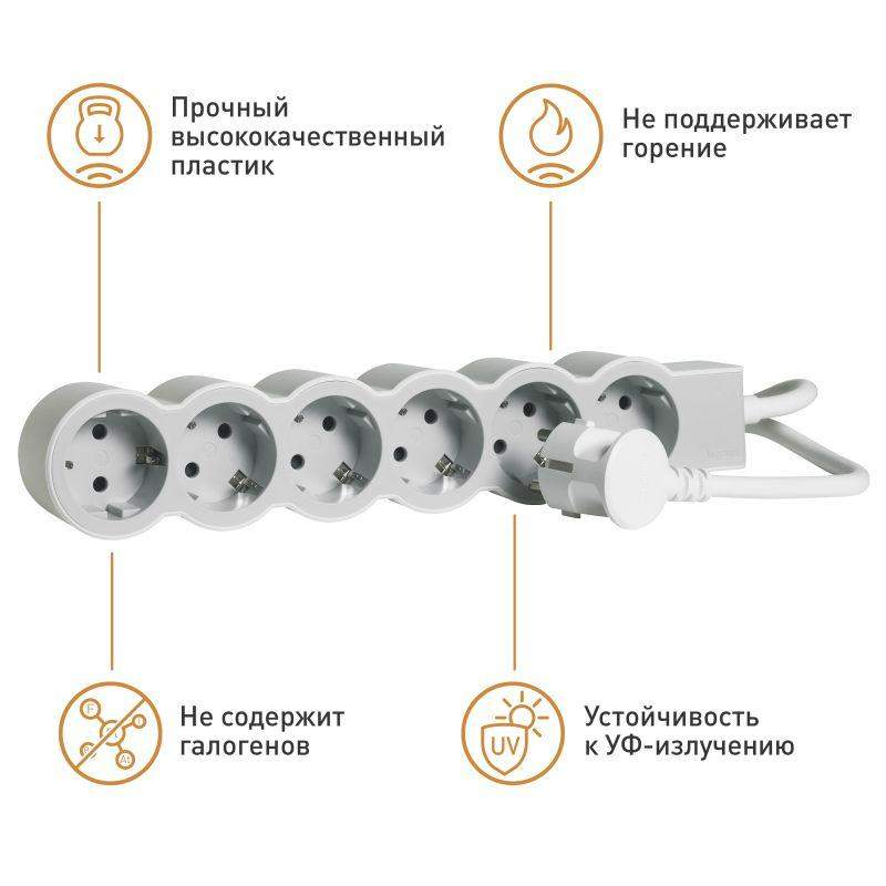 Удлинитель предназначен для подключения электроприборов, расположенных далеко от розеток. Также незаменим для подключения большого количества электроприборов к одной розетке. Конструкция удлинителя и кабель сечением 1,5 мм2 позволяет безбоязненно подключать мощные электроприборы до 3,86 кВт (16А). При этом он обладает компактными размерами, позволяющими размещать удлинитель в ограниченном пространстве (например, под мебелью). Прочная литая вилка с удобным захватом долговечна и удобна при использовании, а специальный кабель устойчив к износу, ударам, неглубоким повреждениям. Корпус удлинителя выполнен из прочного немаркого двухкомпонентного материала с покрытием soft-touch. Все розетки оснащены защитными шторками, которые ограничивают доступ к токоведущим контактам. Высококачественный самозатухающий пластик корпуса не содержит галогенов, устойчив к ультрафиолетовому излучению. Всё это обеспечивает долговечное и безопасное использование удлинителя.
