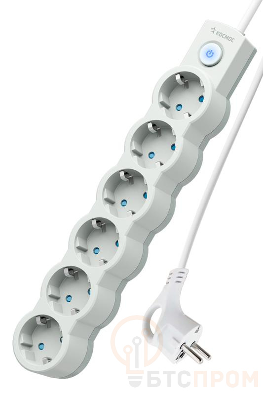 Удлинитель 6х3м с заземл. IP20 с выкл. 10А 2200Вт 220В защ. шторки ПВС 3х1 бел. КОСМОС YKsm3m-6g-Z-V10A-W