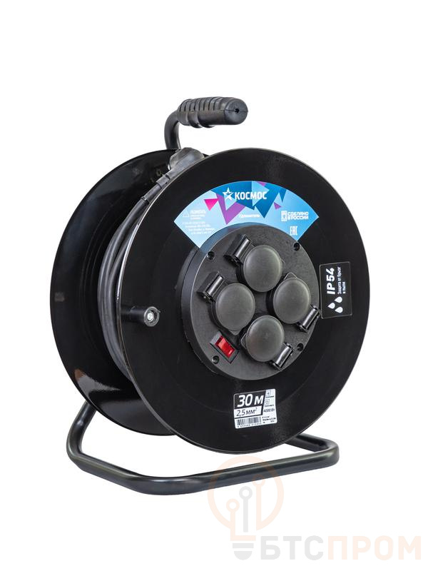 Удлинитель на катушке 4х30м с заземл. 16А IP54 4кВт КГ 3х2.5 термозащ. КОСМОС YKKsm30m-4g-Z(2.5)KG