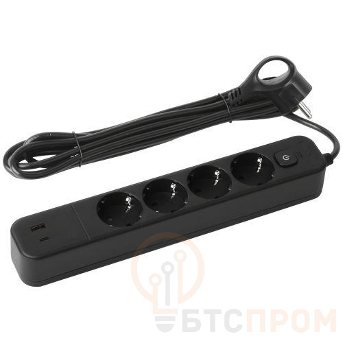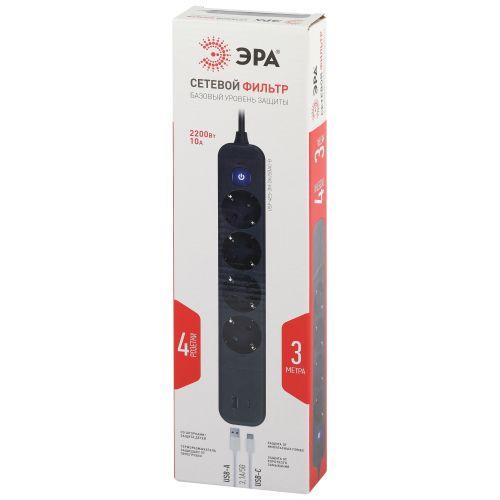 Удлинитель с сетевым фильтром 4х3м с заземл. 10А USF-4es-3m-2xUSBAC-B +2xUSBA+C 3.1A с выкл. с базов. защитой Эра Б0059574