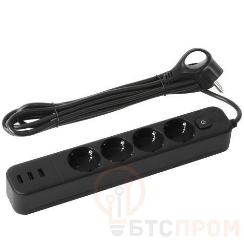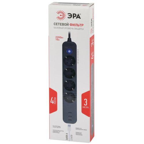Удлинитель с сетевым фильтром 4х3м с заземл. 10А USF-4es-3m-3xUSBA-B +3xUSBA 3.1A с выкл. с базов. защитой Эра Б0059570