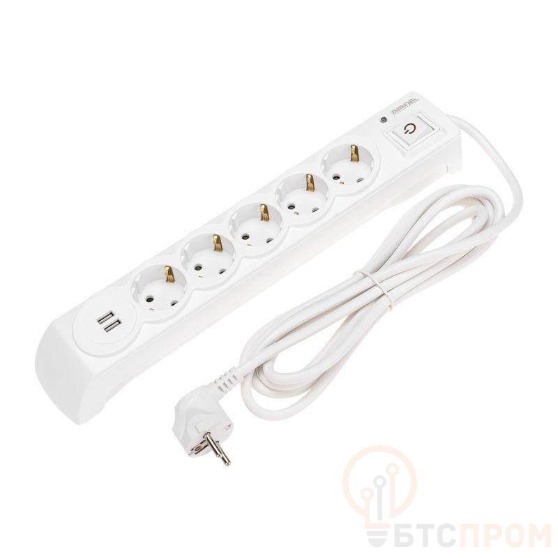 Удлинитель с сетевым фильтром 5х3м с автовыкл. 2 USB КГ 3х1.5кв.мм бел. Kranz 13-4700