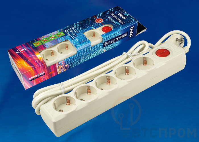 Удлинитель с сетевым фильтром 5х5м с заземл. 10А Universal SGSU5-5 IVORY ПВС 3х0.75 защита от перенапряж. короткого замыкания Uniel UL-00001748