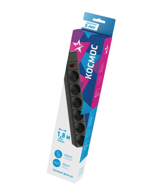 Удлинитель с сетевым фильтром 6х1.8м с заземл. 16А IP20 3.5кВт 3х1 с предохранителем с выкл. с индикатором сети черн. КОСМОС FKsm1.8m-6g(B)16A
