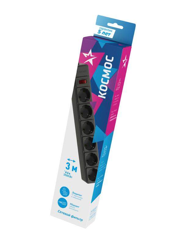 Удлинитель с сетевым фильтром 6х3м с заземл. 16А IP20 3.5кВт 3х1 с предохранителем с выкл. с индикатором сети черн. КОСМОС FKsm3m-6g(B)16A