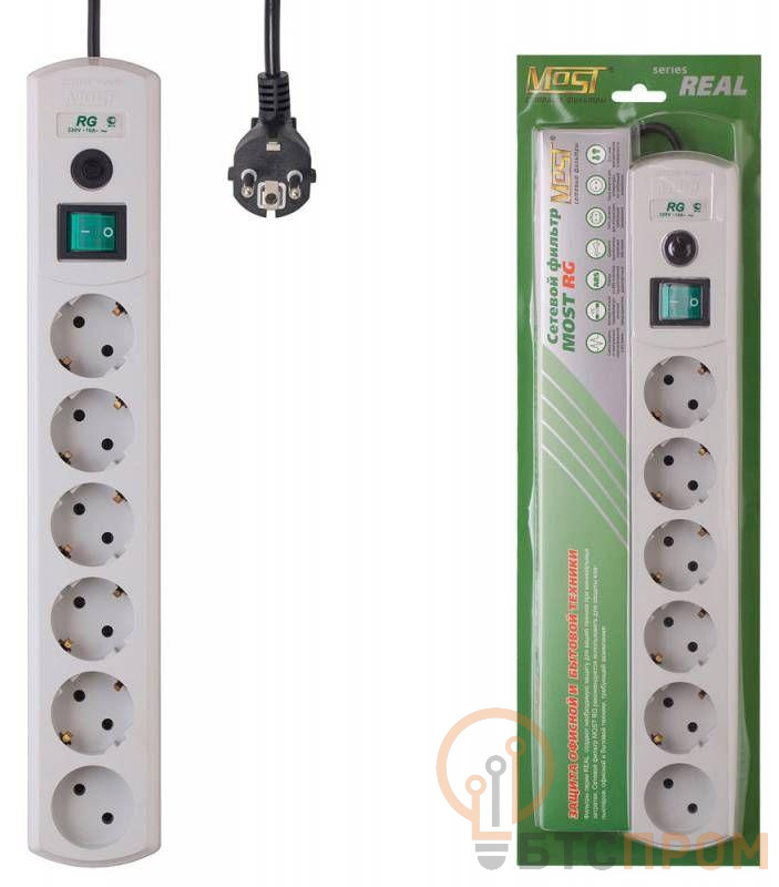 Удлинитель с сетевым фильтром 6х5м 1-м - без заземл. + 5-м - с заземл. 10А ПВС 3х0.75 бел. Most RG 587278