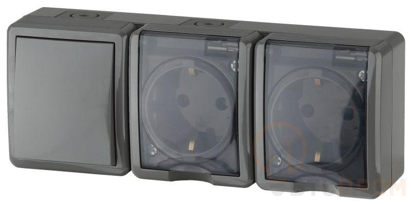 Блок две розетки с выключателем IP54 Эра Эксперт открытой установки серый 11-7403-03. Номинальные характеристики 16А(10AX) 250В. Устройство выполнено из качественного поликарбоната, оснащёно уникальными винтовыми клеммами ЭКСПЕРТ для максимально качественного зажима кабеля в механизме.
