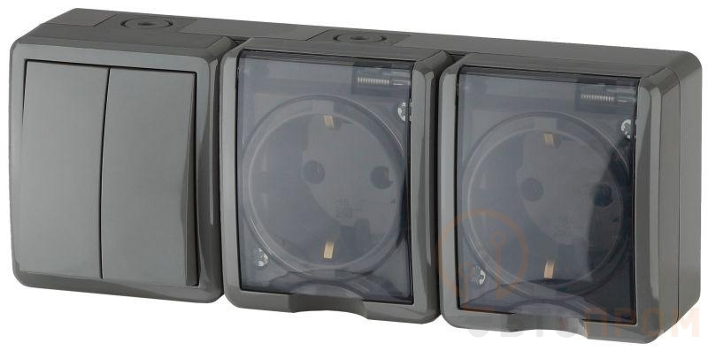 Блок две розетки с двойным выключателем IP54 Эра Эксперт открытой установки серый 11-7404-03. Номинальные характеристики 16А(10AX) 250В. Устройство выполнено из качественного поликарбоната, оснащёно уникальными винтовыми клеммами ЭКСПЕРТ для максимально качественного зажима кабеля в механизме.