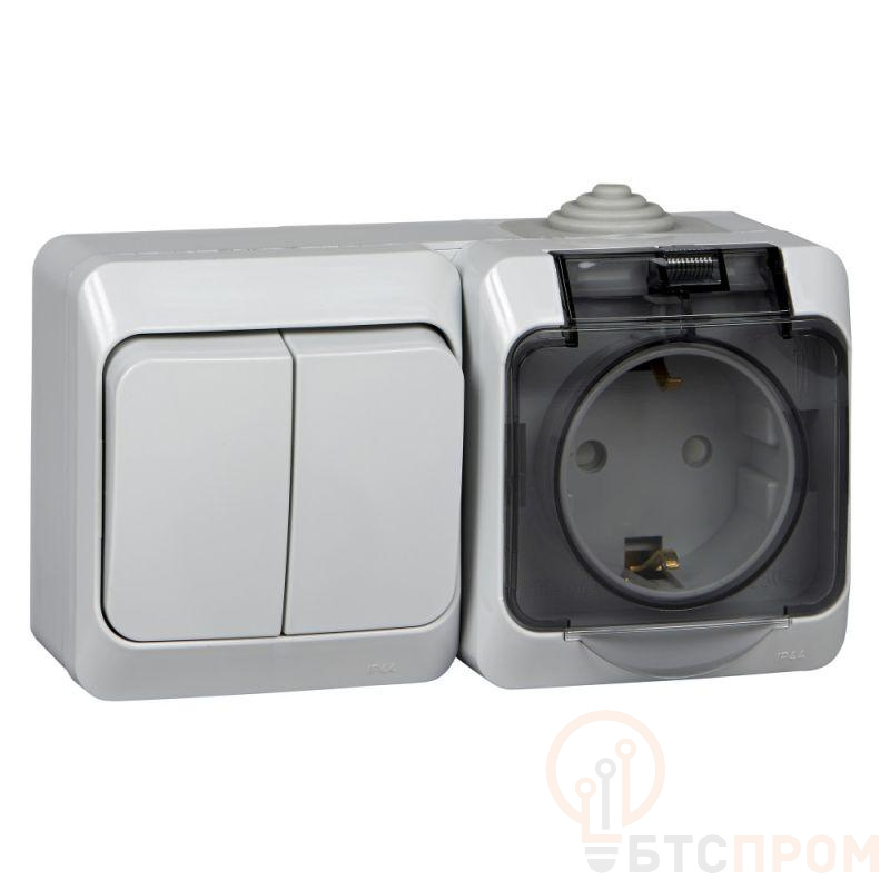 Блок Systeme Electric (ранее Schneider Electric) ЭТЮД (серый, открытой установки) предназначен для применения в сетях до 250В, состоит из розетки на 16А, со шторками, без заземления и двухклавишного выключателя на 10А. Две клавиши позволяют управлять двумя источниками света с одной точки. Он удобен в применении и отлично подходит для ванной комнаты (IP44). Сделано в России.