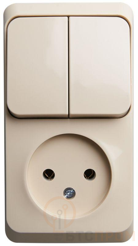 Блок Systeme Electric (ранее Schneider Electric) ЭТЮД (кремовый, открытой установки) предназначен для применения в сетях до 250В, состоит из розетки без заземления, без шторок на 16А, и двухклавишного выключателя на 10А. Две клавиши позволяют управлять двумя источниками света с одной точки. Он удобен в применении и отлично подходит для коридора. Сделано в России.