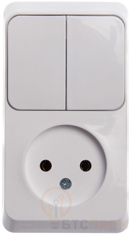 Блок Systeme Electric (ранее Schneider Electric) ЭТЮД (белый, открытой установки) предназначен для применения в сетях до 250В, состоит из розетки без заземления, без шторок на 16А, и двухклавишного выключателя на 10А. Две клавиши позволяют управлять двумя источниками света с одной точки. Он удобен в применении и отлично подходит для коридора. Сделано в России.