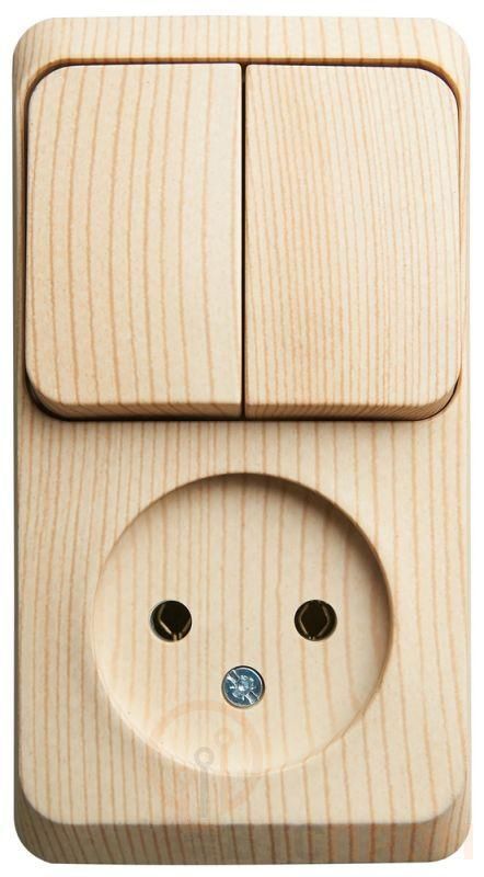 Блок Systeme Electric (ранее Schneider Electric) ЭТЮД (сосна, открытой установки) предназначен для применения в сетях до 250В, состоит из розетки без заземления, без шторок на 16А, и двухклавишного выключателя на 10А. Две клавиши позволяют управлять двумя источниками света с одной точки. Он удобен в применении и отлично подходит для коридора. Изделия цвета Сосна обладают уникальным рисунком, напоминающим древесный сруб. Сделано в России.