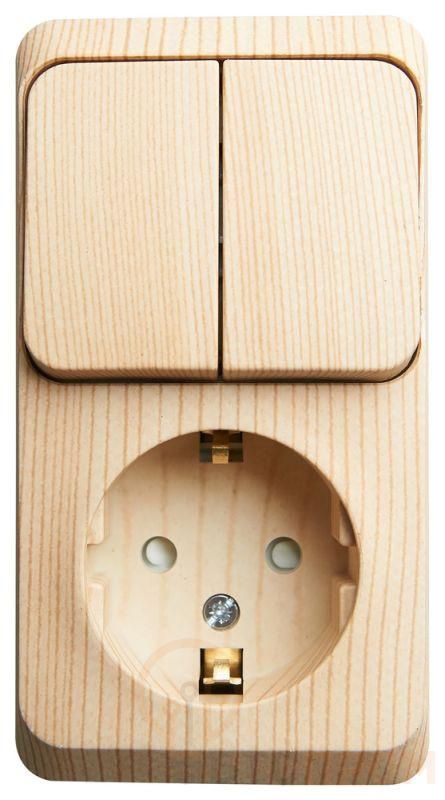 Блок Systeme Electric (ранее Schneider Electric) ЭТЮД (сосна, открытой установки) предназначен для применения в сетях до 250В, состоит из розетки на 16А с заземлением и шторками и двухклавишного выключателя на 10А. Две клавиши позволяют управлять двумя источниками света с одной точки. Он удобен в применении и отлично подходит для коридора. Изделия цвета Сосна обладают уникальным рисунком, напоминающим древесный сруб. Сделано в России.