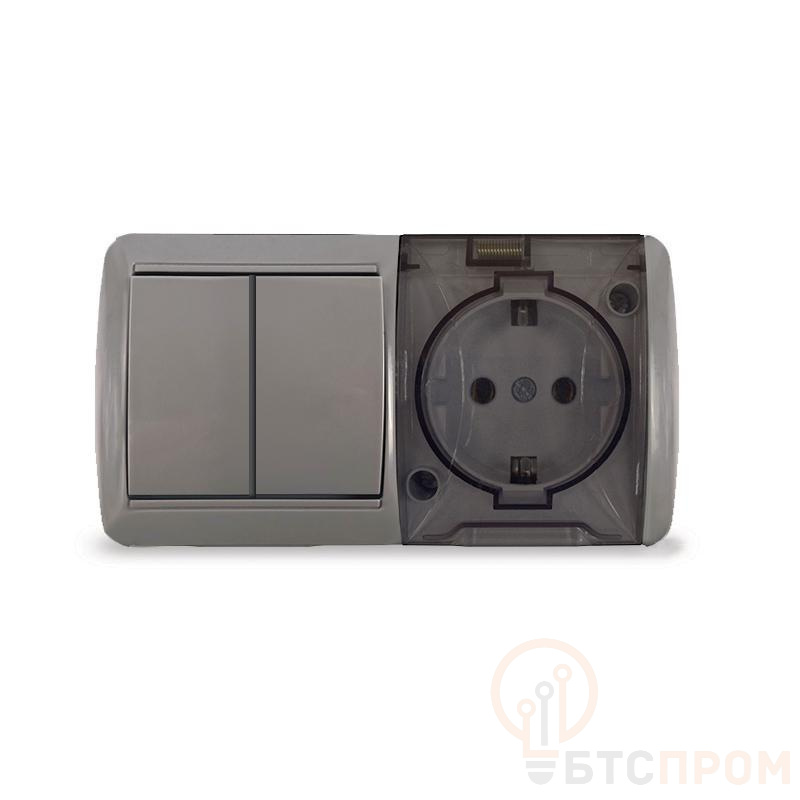 Блок ОП Клио 2-кл. выкл. 10А + розетка 1-м 16А 250В с заземл. с прозр. крышкой сер. Universal К2239-Gr