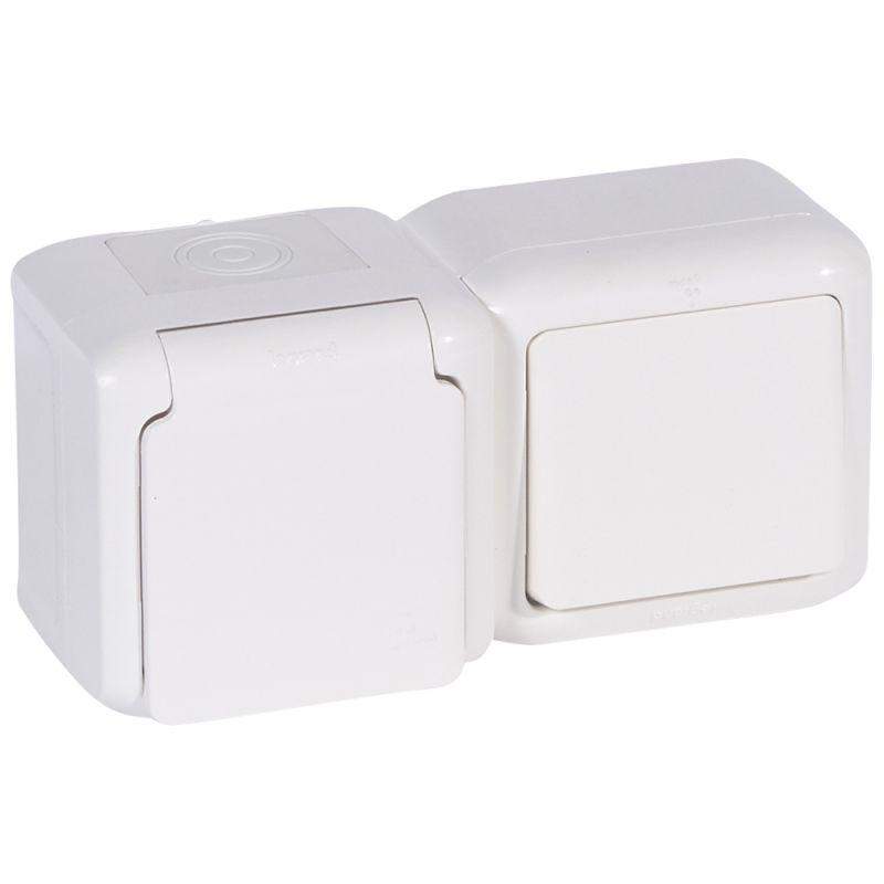 Блок ОП выключатель + розетка с заземл. защ. шторки IP44 Quteo бел. Leg 782318 фото в каталоге от BTSprom.by