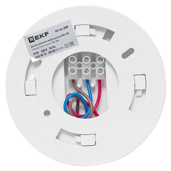 Датчик движения инфракрасный MS-20B предназначен для экономии электроэнергии за счет автоматического управления освещением и другими инженерными системами. Датчик реагирует на движение людей и других объектов в зоне действия сенсора, принцип работы датчика основан на отслеживании уровня ИК-излучения в поле зрения. Датчик MS-20B предназначен для накладного монтажа на потолок. Рекомендуется использовать датчик в кладовках, гардеробных и других помещениях с временным пребыванием людей. Алгоритм работы: при возникновении движения в поле зрения датчика встроенное электромеханическое реле (рассчитано на полную мощность 1200Вт) коммутирует подключенную нагрузку. После этого нагрузка находится под напряжением в течение заданного времени (от 10 сек. до 7 минут, время настраивается) и выключается. Дополнительно датчик имеет функцию контроля освещенности. Если освещенность в зоне детекции выше заданного уровня (настраивается), то нагрузка включаться не будет, что позволяет дополнительно экономить электроэнергию.