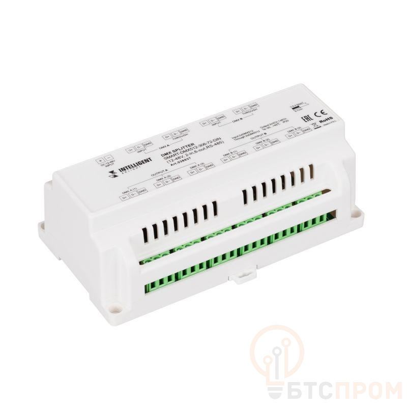 Сплиттер SMART-DMX512-306-72-DIN — это надежное устройство для разветвления и усиления DMX-сигнала в системах профессионального освещения. Корпус из металла с защитой IP20 предназначен для установки в стандартную DIN-рейку в шкафах управления.